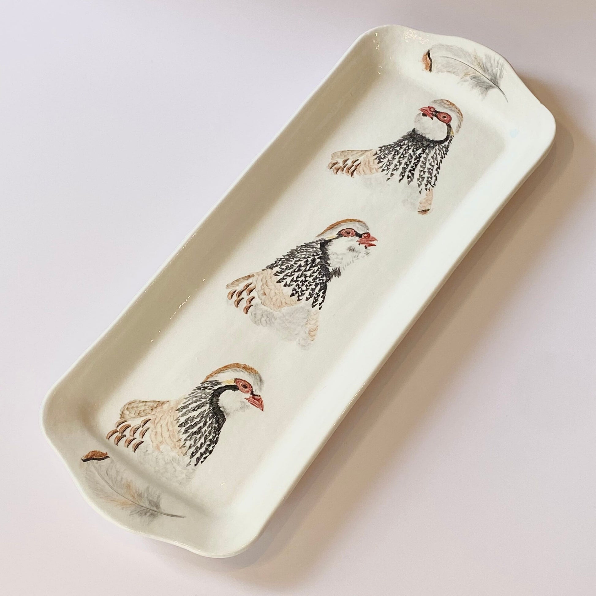 Nuestra bandeja de cerámica artesanal está hecha y pintada a mano en Madrid, formando parte de una colección que rinde homenaje a la perdiz, una de las aves más representativas de nuestro campo. En esta pieza alargada, las perdices aparecen delicadamente ilustradas con un trazo minucioso y cálido, donde destacan sus tonos tierra, el plumaje detallado y las pequeñas plumas que completan la composición.